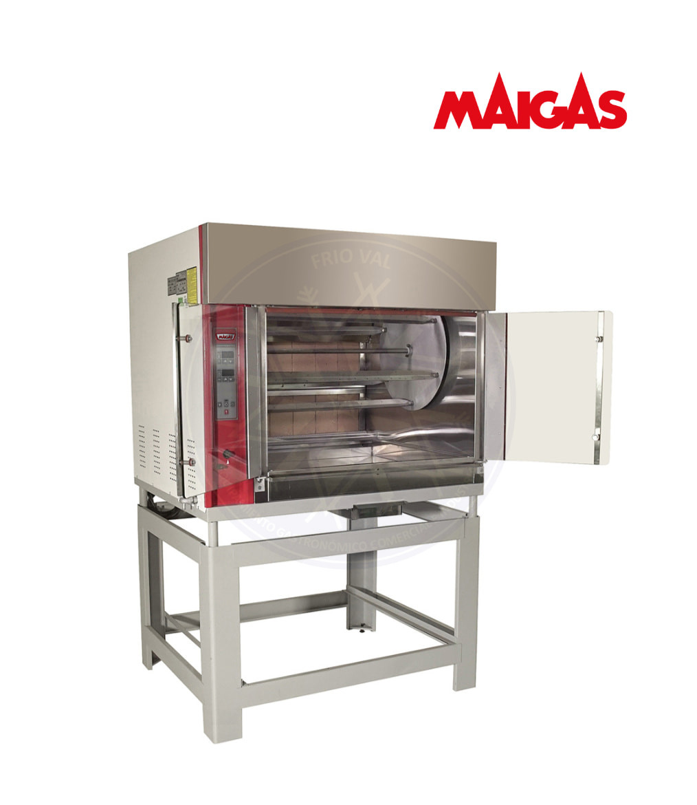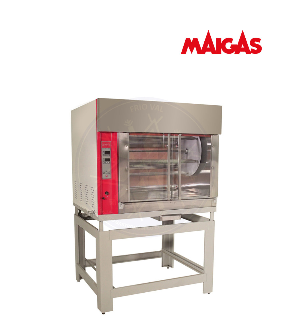 Construido en un conjunto de acero inoxidable y acero. Posee una capacidad de 18 a 24 pollos los cuales tienen un manejo homogéneo debido al interior de cámara con ladrillos refractarios. Posee puertas de vidrio templado, las cuales ayudan a la visualización de parte de los clientes y el monitoreo de los productos para el usuario. Incluye bandeja recolectora de grasa construida en acero inoxidable, por otro lado, trae un atril de acero esmaltado al horno. Posee un panel de control digital, el cual permite controlar la temperatura, la velocidad y el tiempo en el que se asarán los pollos. Ladrillos refractarios, transmisión piñón cadena con motoreductor.