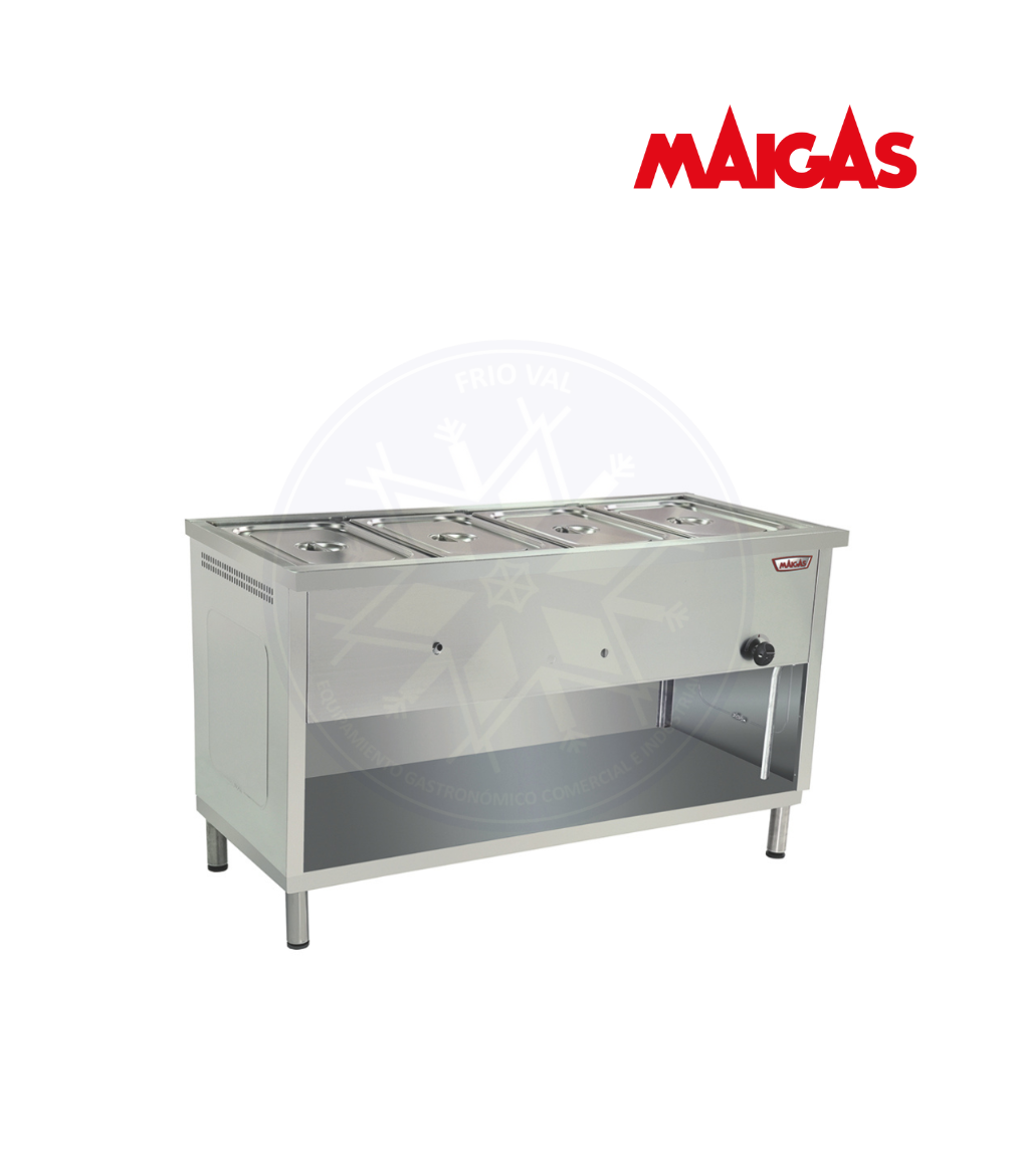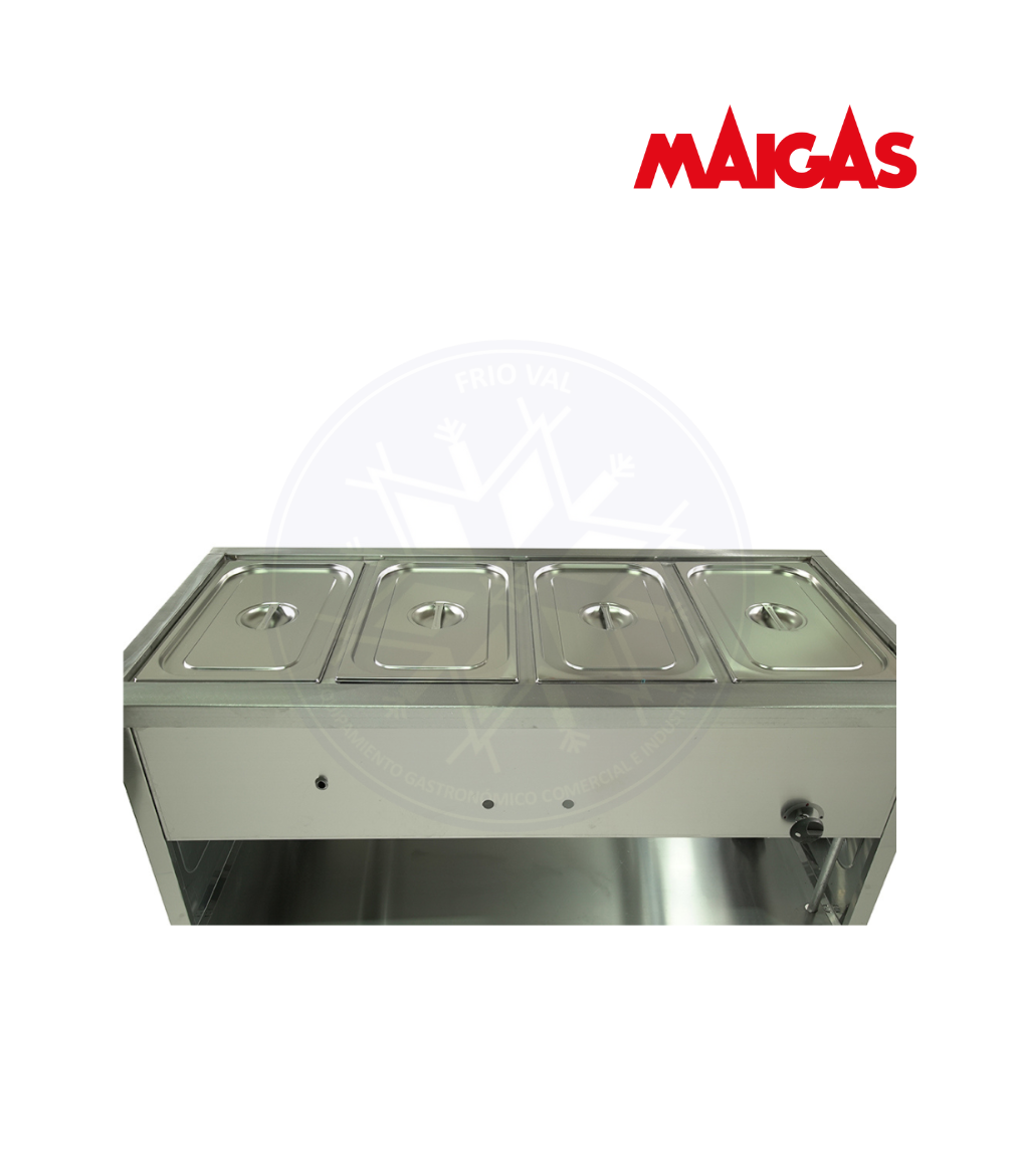 Módulo baño maría construido íntegramente en acero inoxidable, posee 4 depósitos GN 1/1 (20 LTS. C/U) con quemadores tubulares comandados por una llave de 3 posiciones con dispositivo de seguridad. Puede ser utilizado en cocinas, restaurantes y casinos ya que en ellos se potencia su función de calentar los alimentos a vapor de manera suave, uniforme y constante.