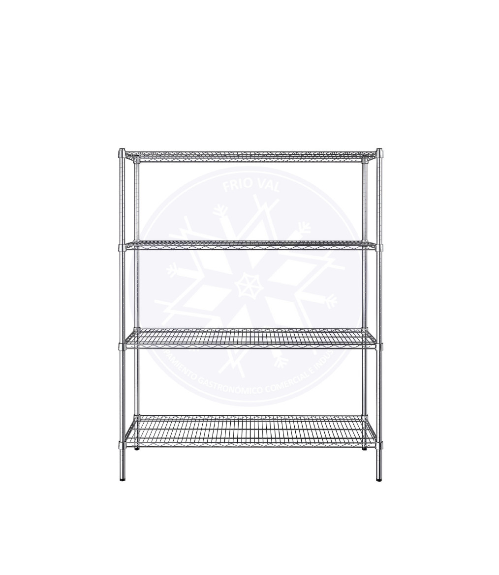 Estante metálico de acero cromado de fácil armado. Posee una estructura sólida con cuatro repisas tipo rejilla, las cuales pueden fijarse a cualquier altura. Sus pilares cilíndricos y resistentes, logran una excelente presentación de cualquier producto que quiera almacenar. Además, incluye topes de goma en sus patas, para disminuir el deslizamiento de la estantería. Muy utilizadas en espacios interiores de locales de comida, en bodegas, y en ambientes domésticos.