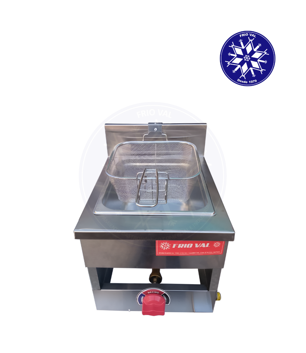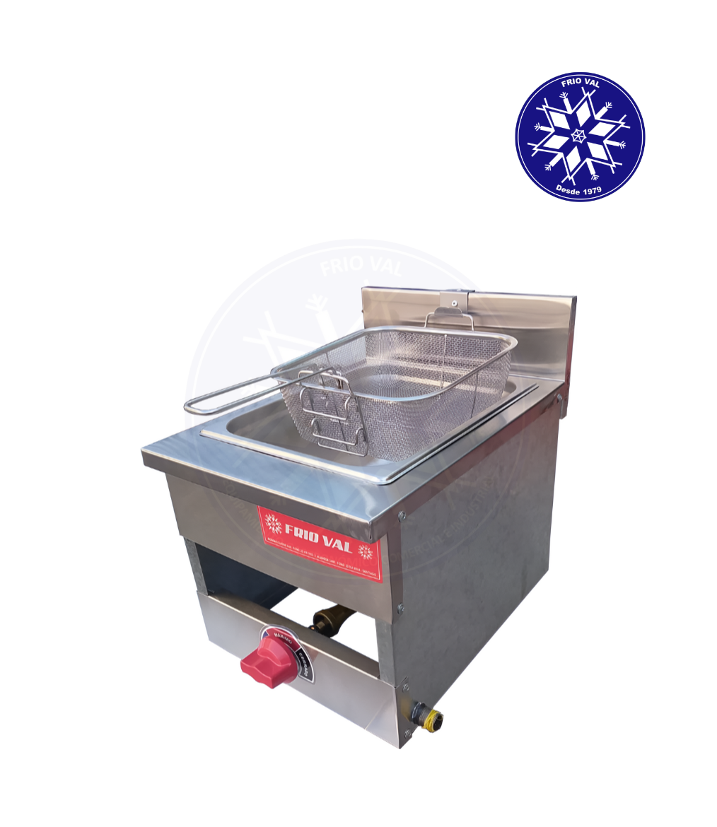 Freidora a gas nacional de gran capacidad y resistente material. Posee un depósito para 9 lt máximo de aceite para poder freír diferentes productos, los cuales pueden freírse en un canasto con capacidad de 2 kg de papas congeladas, aproximadamente. Su estructura de acero inoxidable y acero galvanizado, le otorgan durabilidad e higiene. Debido a su tamaño y fácil localización, se convierte en la mejor opción para food truck, cocinerías, locales de comida rápida o eventos gastronómicos.