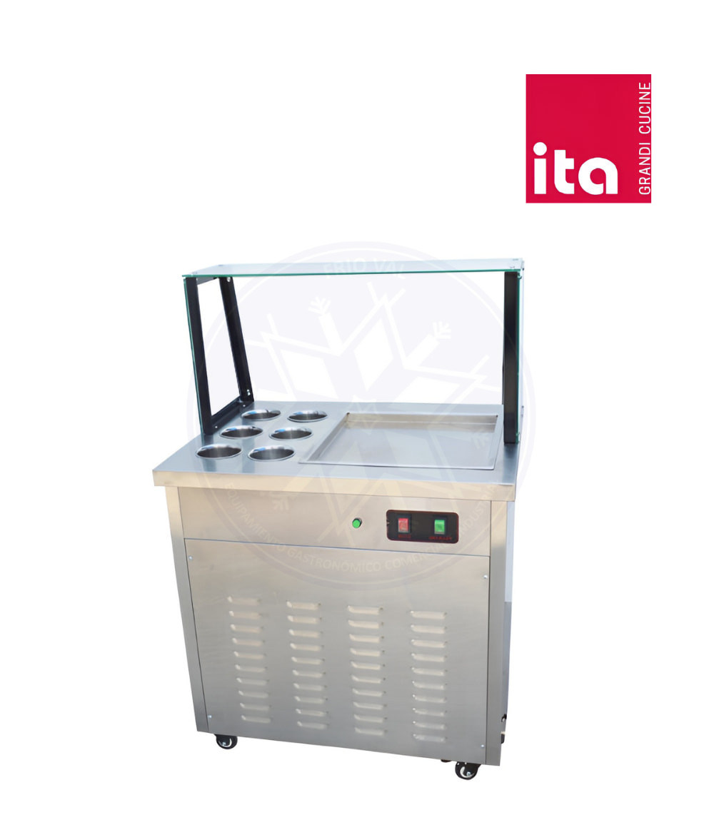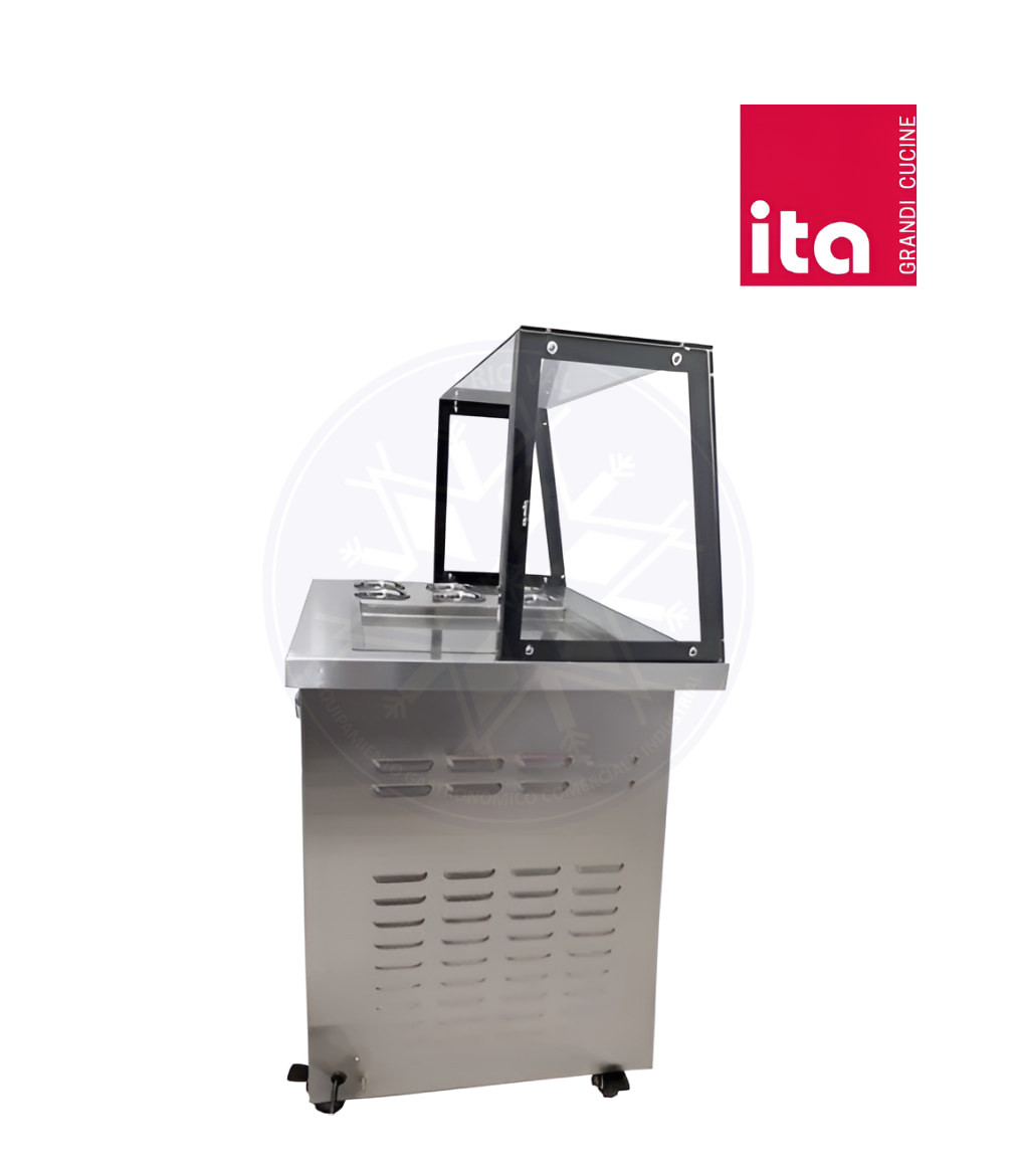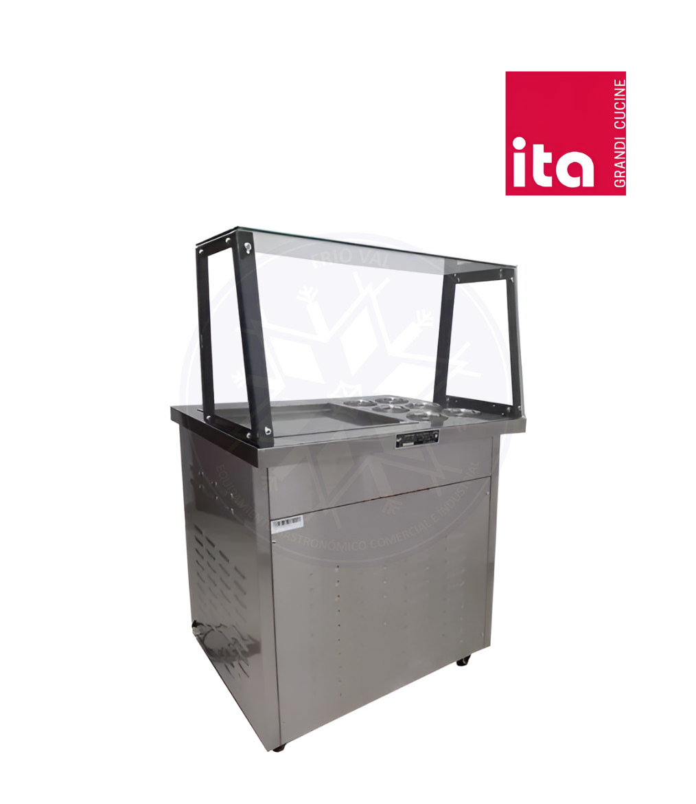 Equipo fabricado en acero inoxidable de grado alimenticio, con un aspecto elegante e higiénico. Posee un compresor de alta capacidad, el cual asegura un rápido y constante enfriamiento del equipo, disminuyendo demoras en la atención a público. Posee ruedas para un óptimo desplazamiento, de fácil operación y mantenimiento. Diseño ideal para negocios de heladería o como complemento para pizzerías, cafeterías, restaurantes y centros turísticos.