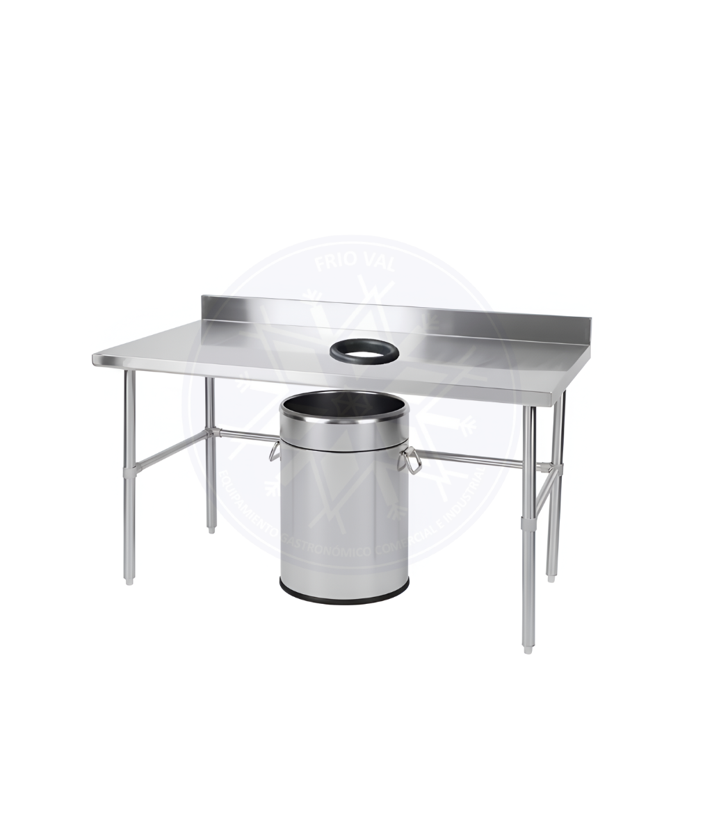 Los mesones de desconche son ideales para agilizar y mantener la limpieza e higiene en los entornos gastronómicos. Son mesones de acero con un orificio en el centro, para eliminar fácilmente desechos y desperdicios, por medio de la instalación de una bolsa, o bien, un basurero debajo del mesón. Son versátiles, resistentes, y necesarios para poder cumplir las normas sanitarias que se exigen en el rubro gastronómico.