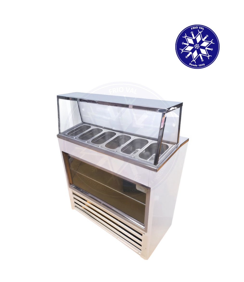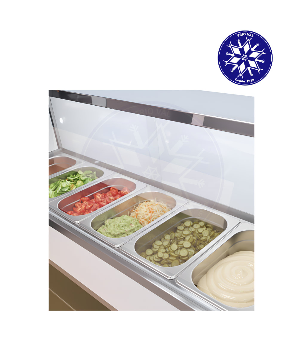 Vitrina salsera que permite la conservación refrigerada de productos vegetales, ideal para negocios que preparen sándwich, completos, pizzas, fajitas, entre muchas más opciones. Posee una vitrina panorámica superior de vidrio anti estornudo, y una vitrina inferior para exhibir productos. Sus dos puertas de correderas facilitan el uso del operador incluso mientras prepara los productos. Gracias a sus ruedas, dos de ellas con frenos, puede ubicarse y movilizarse de manera sencilla a cualquier posición.